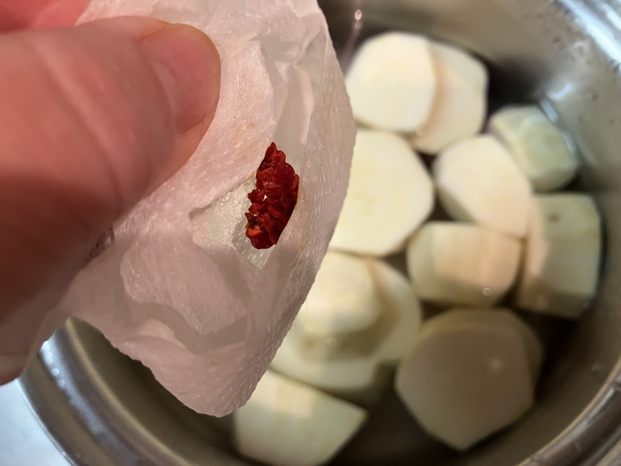 くわい(オモダカ科水生多年草)。”皆さんの芽が出ますように”の願いを込めて。あらかじめ煮たものを上新粉をつけて揚げ焼きします。