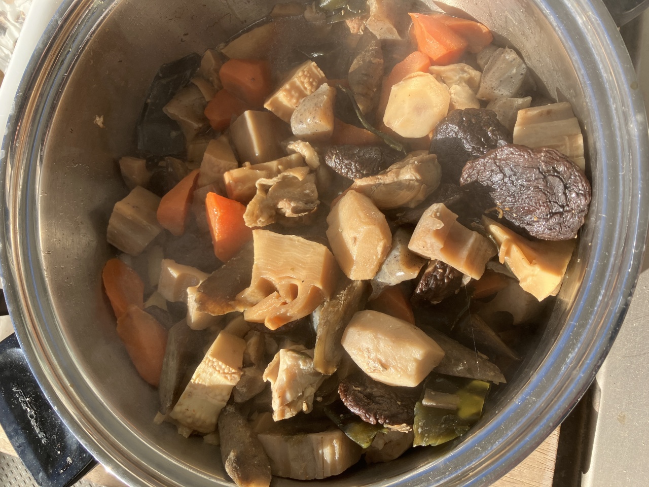 4段重に入る「お煮染め」は家族円満の祈りを込めた一品。色々な食材が一つの鍋で互いに影響を与え合い、それぞれの持ち味を活かして良い具合に煮しまってゆくことから。一度冷ますと煮物は味が染みておいしくなります。