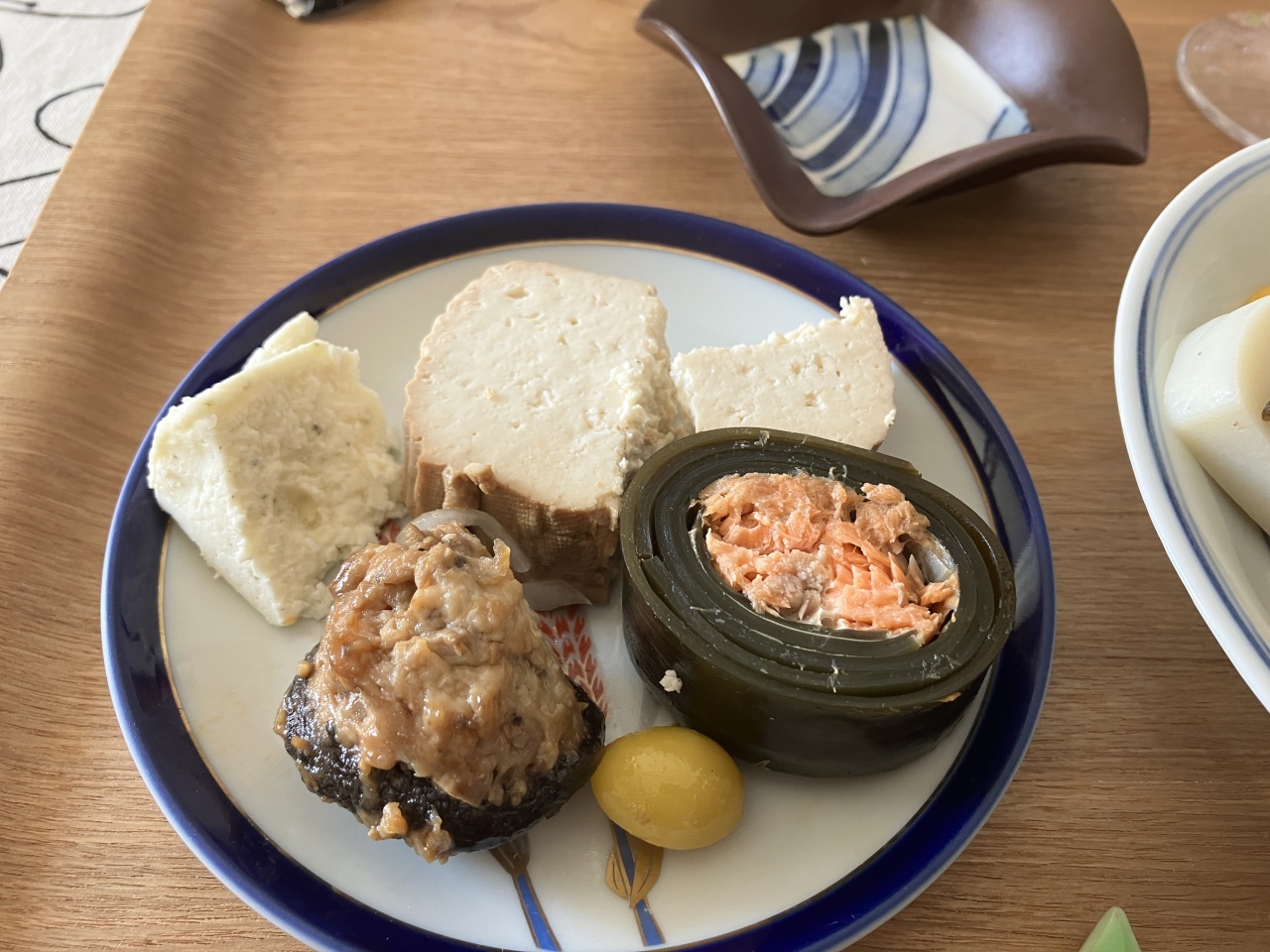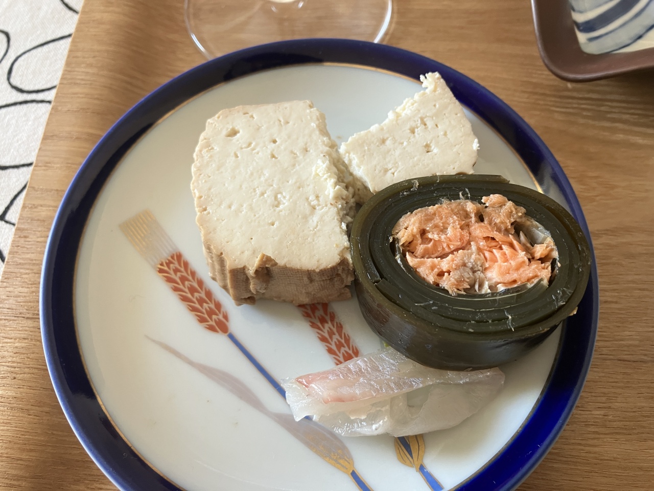 締め豆腐(『おごっそうの玉手箱』より、取材以降恒例となっている一品。今年は沖縄の島豆腐で作ってみたところ上々の仕上がりでした。今年の昆布巻きは鮭。